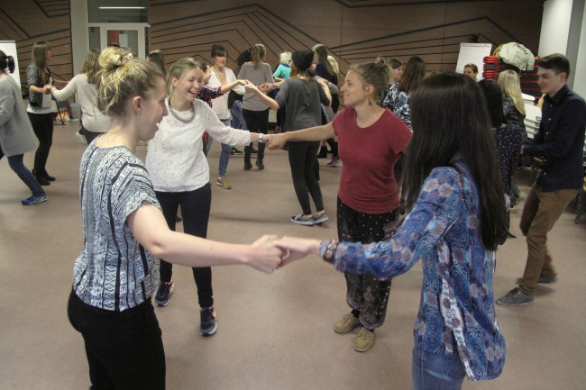 Teaching English in Laos hat sich als festes Seminar im Fächerangebot der PH Karlsruhe verankert. Im April wurde die Ausschreibung um Volontäre an der Hochschule veröffentlicht, am 06. Mai fanden die Bewerbungsgespräche für die neun ab September zur Verfügung stehenden Volontariatsplätze in Laos statt. 14 BewerberInnen wurden zu persönlichen Gesprächen von Projektleitung und dem Akademischen Auslandsamt der PH Karlsruhe eingeladen, nach denen die neun Plätze vergeben wurden. Am 27. Mai fand der erste von drei Seminarterminen im Sommersemester des fächerverbindenden Projekts „Teaching English in Laos“ an der PH Karlsruhe statt. Prof. Dr. Isabel Martin führte einen „Singlish“ workshop speziell mit Liedern für Laos ausgesucht durch, in dem die Volontäre bereits die interkulturellen Besonderheiten kennenlernen konnten – welche Tiere und Dinge die Kinder etwa kennen und welche nicht. Bei einem gemeinsamen Abendessen nach Ende des Seminars konnten sich Volontäre und Projektleitung näher kennenlernen. Ein Bericht zu der Veranstaltung findet sich auf dem Blog The Laos Experience. Ergänzt wurden und werden die Vorbereitungen im Seminar durch die Teilnahme an zusätzlichen workshops, etwa Square Dance und Caller workshops.