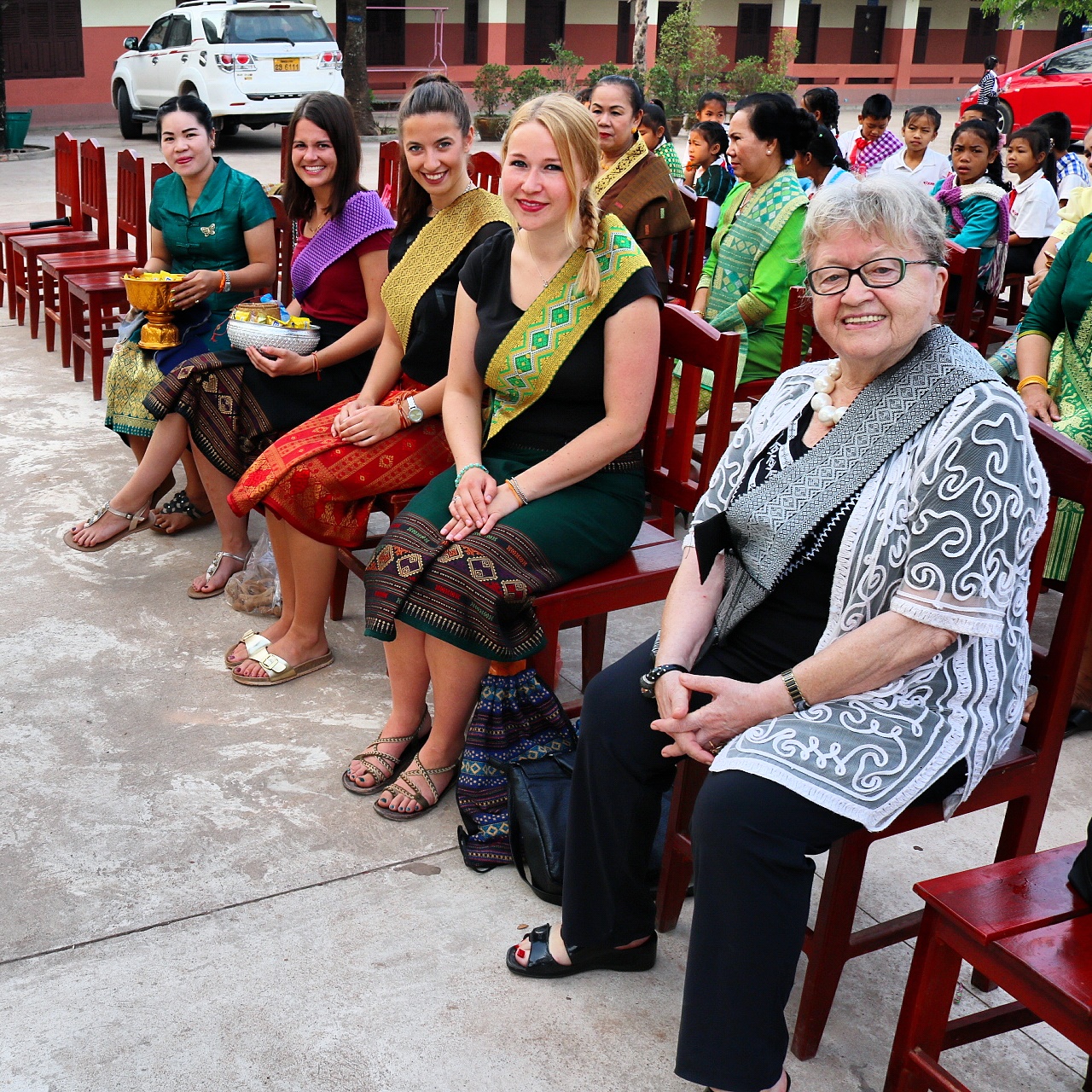 - Stiftungsvorständing Gerlinde Engel mit den Volontären der PH Karlsruhe Veronika, Alyssa, Jessica und Lehrerin Bounpheng