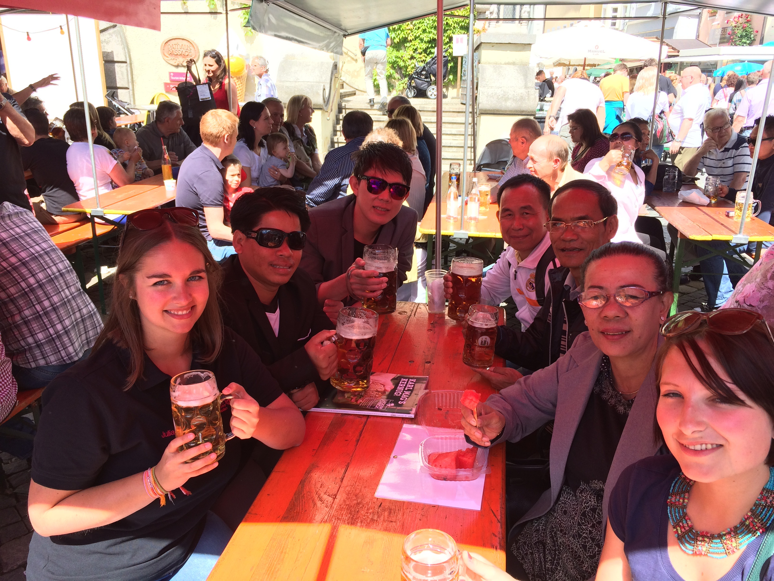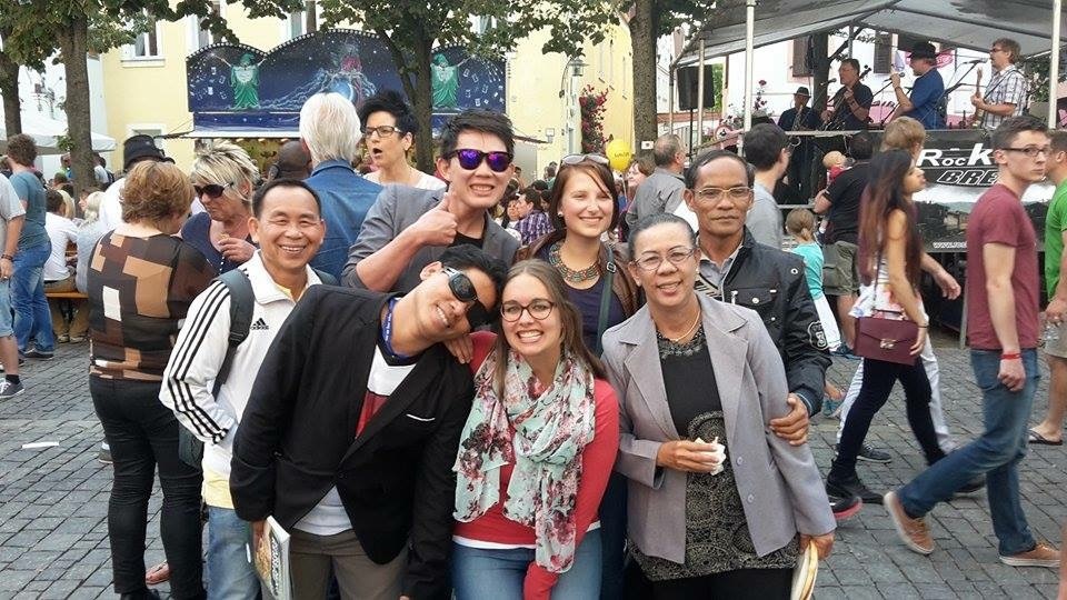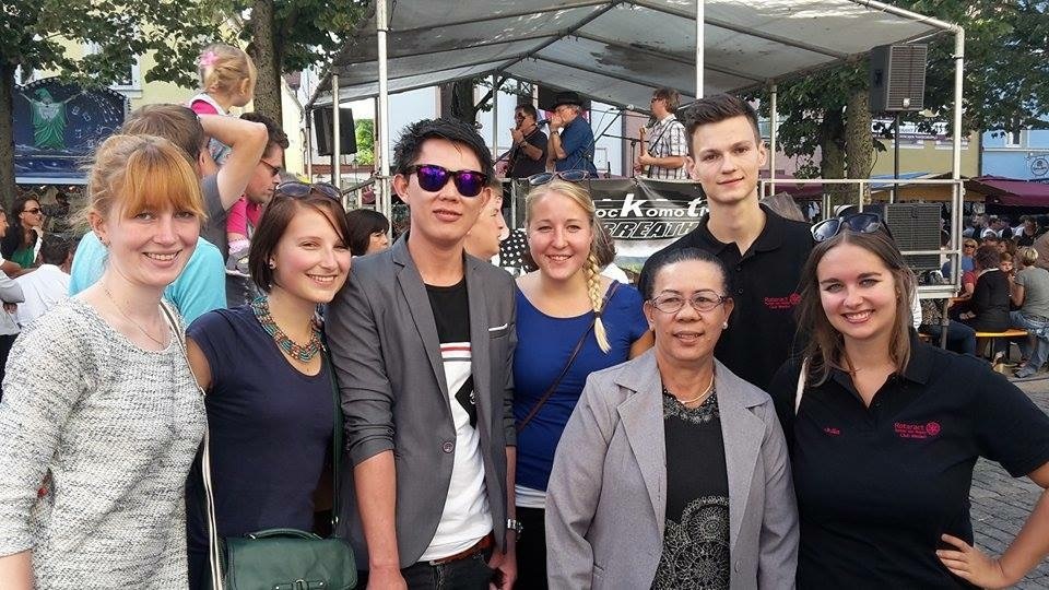 Gemeinsam mit den ehemaligen Volontären der Stiftung, Julia Binapfl, Eva Kießling, Nina Belchschmid und Sonja Wolf besuchte die laotische Delegation das Bürgerfest in Weiden am 28. Juni.